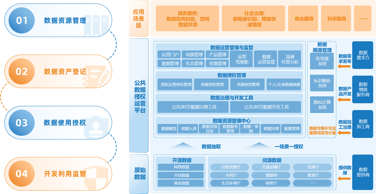 平台建设了数据资源管理、数据资产登记、数据使用授权、开发利用监管等四大板块,为数据开发商、数据运营商提供全流程线上服务。