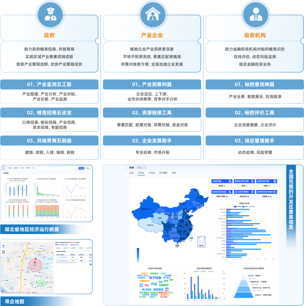 产业发展大数据平台立志成为政府部门精准招商的有力助手,产业企业寻求合作、优化资源配置的重要平台,投资企业了解地方产业投资环境、寻找优质投资项目的重要窗口。