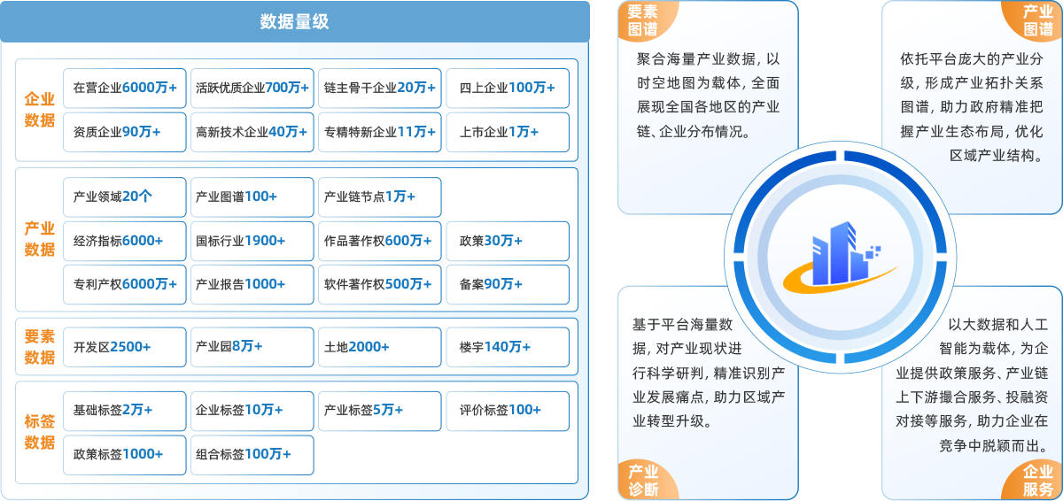 产业发展大数据平台依托其庞大的企业数据库和全方位的产业相关数据,构建了“四库、一平台、四场景”的产业发展服务体系。平台拥有超亿级的海量数据,包含企业数据、区域要素数据、产业链数据,涵盖了从企业到产业链上下游分布,再到地区资源要素等全景数据,满足政府及产业企业在发展过程中的多元化需求。