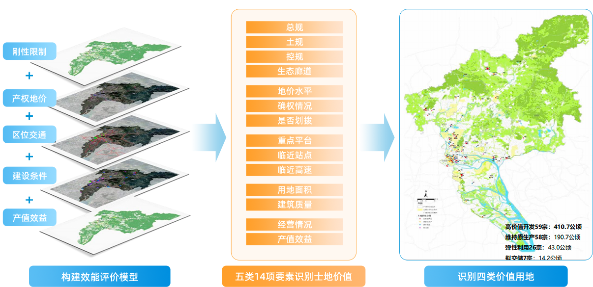按照“摸-筛-理-定”技术框架,构建土地效能评价模型,分类分策研判开发价值,最大化释放国资土地发展效能,保障国资权益;